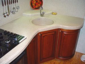 Искусственный камень при определенном температурном воздействии на него приобретает особую пластичность, и благодаря этому ему можно придать практически любую форму. Таким образом, столешница из такого камня может стать украшением интерьера и может выгодно использовать пространство помещения.