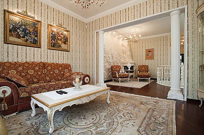 В качестве декоративных атрибутов этот интерьер обязательно использует картины в массивных, золоченых рамах, что говорит о респектабельности и самодостаточности хозяина квартиры. Великолепно впишутся в интерьерный дизайн любые предметы антиквариата.
