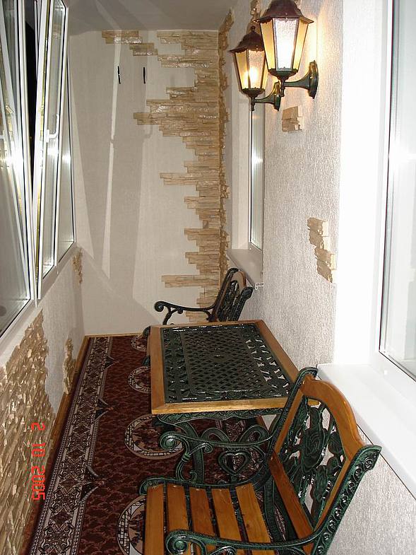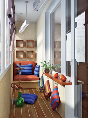Кроме того, обычно все лоджии очень небольшие и нужно стремиться подобрать такой дизайн, чтобы она казалась больше, чем на самом деле. Для этого можно использовать некоторые дизайнерские хитрости и приемы. К примеру, успешно будут выглядеть стены светлых тонов, легкие занавески на окнах и точечное освещение. Также стены и потолок лоджии можно украсить зеркальными элементами, это так же существенно придаст объема лоджии.