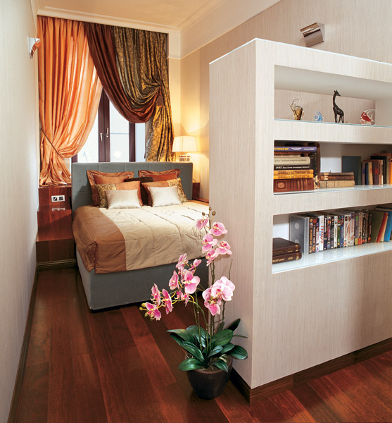 От остальной части спальню, естественно, было бы идеальнее всего отгородить. Это можно сделать с помощью обычных вертикальных жалюзей или же с помощью штор, размещенных на карнизе, прикрепленном к потолку например.