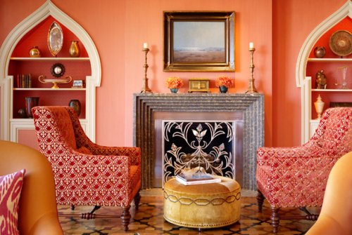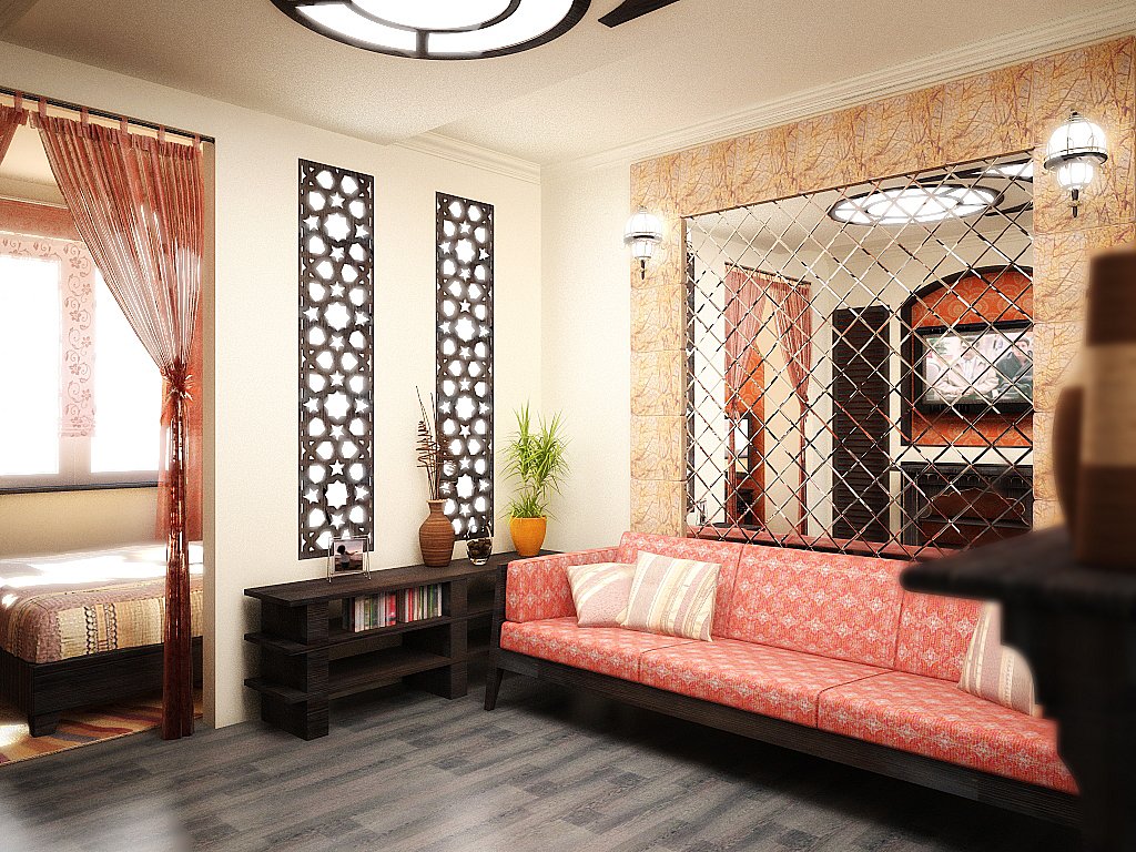 Текстиль в таком интерьере представлен портьерами, подушками и покрывалами ярких цветов. Все это обильно украшается вышивкой и золотой отделкой. Традиционно используются такие ткани, как бархат, шелк и органза. Пол и стены украшаются яркими коврами.