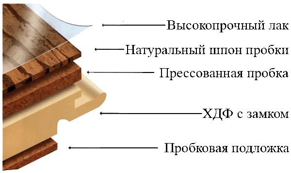 Панель пробкового пола состоит из четырех основных слоев, хотя у разных производителей их количество и состав могут отличаться. В качестве основания используется плита из HDF или MDF, над которым располагается специальная изолирующая прослойка. Далее идет слой самой пробки – измельченной и спрессованной коры определенных пород дуба. И верхний слой – это шар шпона, который выполняет функции защиты и декоративного украшения.
